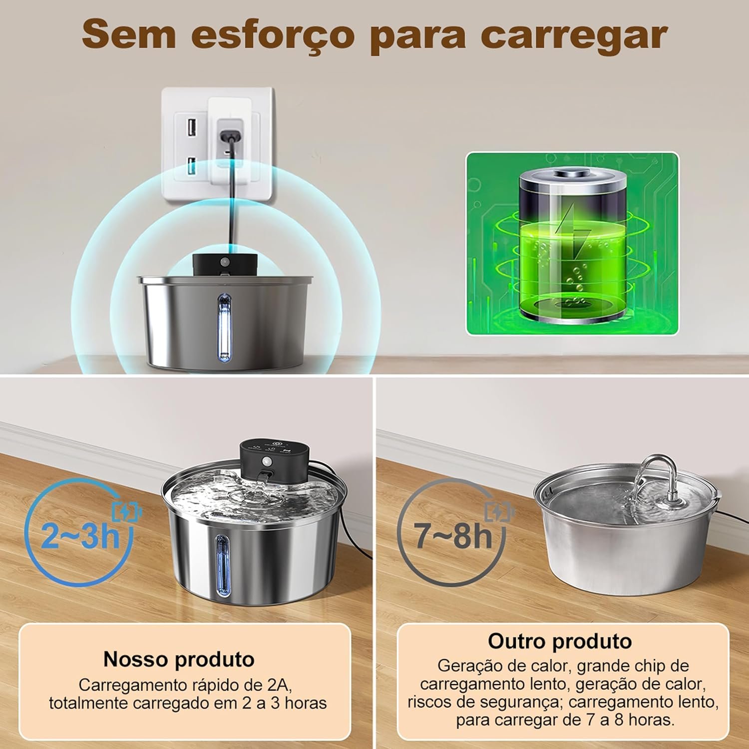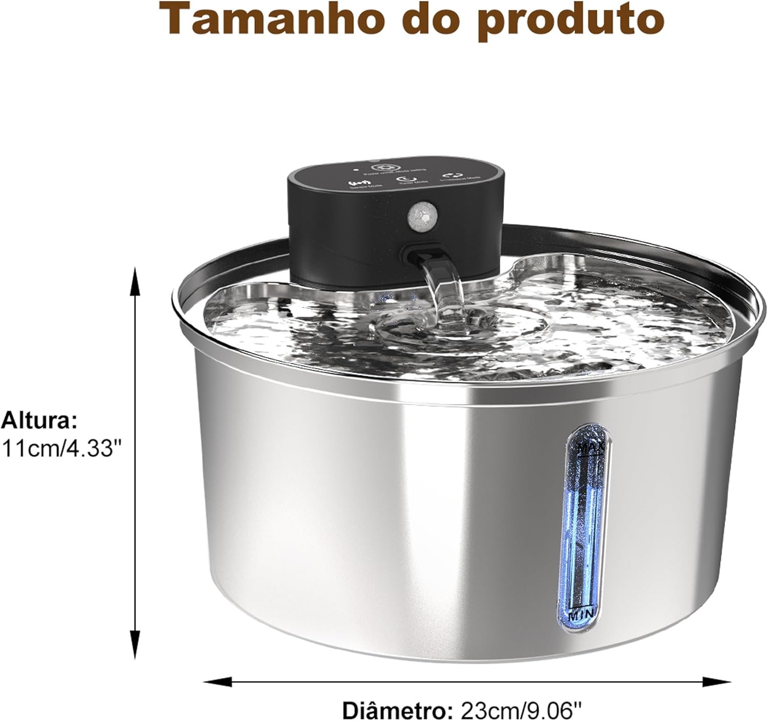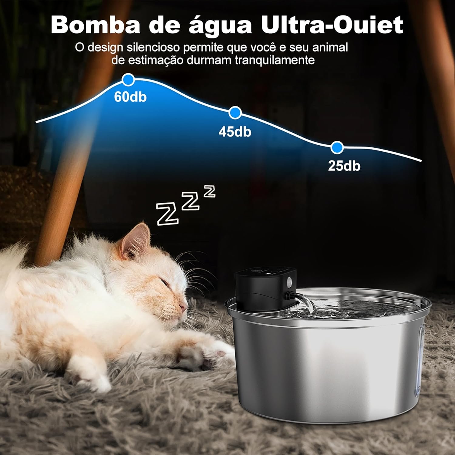 Além disso, a bomba do Bebedouro para Gatos Fonte de Aço Inoxidável foi projetada para durabilidade extrema. Ela mantém o fluxo constante, o que oxigena a água e a mantém em uma temperatura levemente mais baixa e agradável para o paladar do gato. Este modelo é perfeito para quem busca um item que dure anos, e não apenas meses.