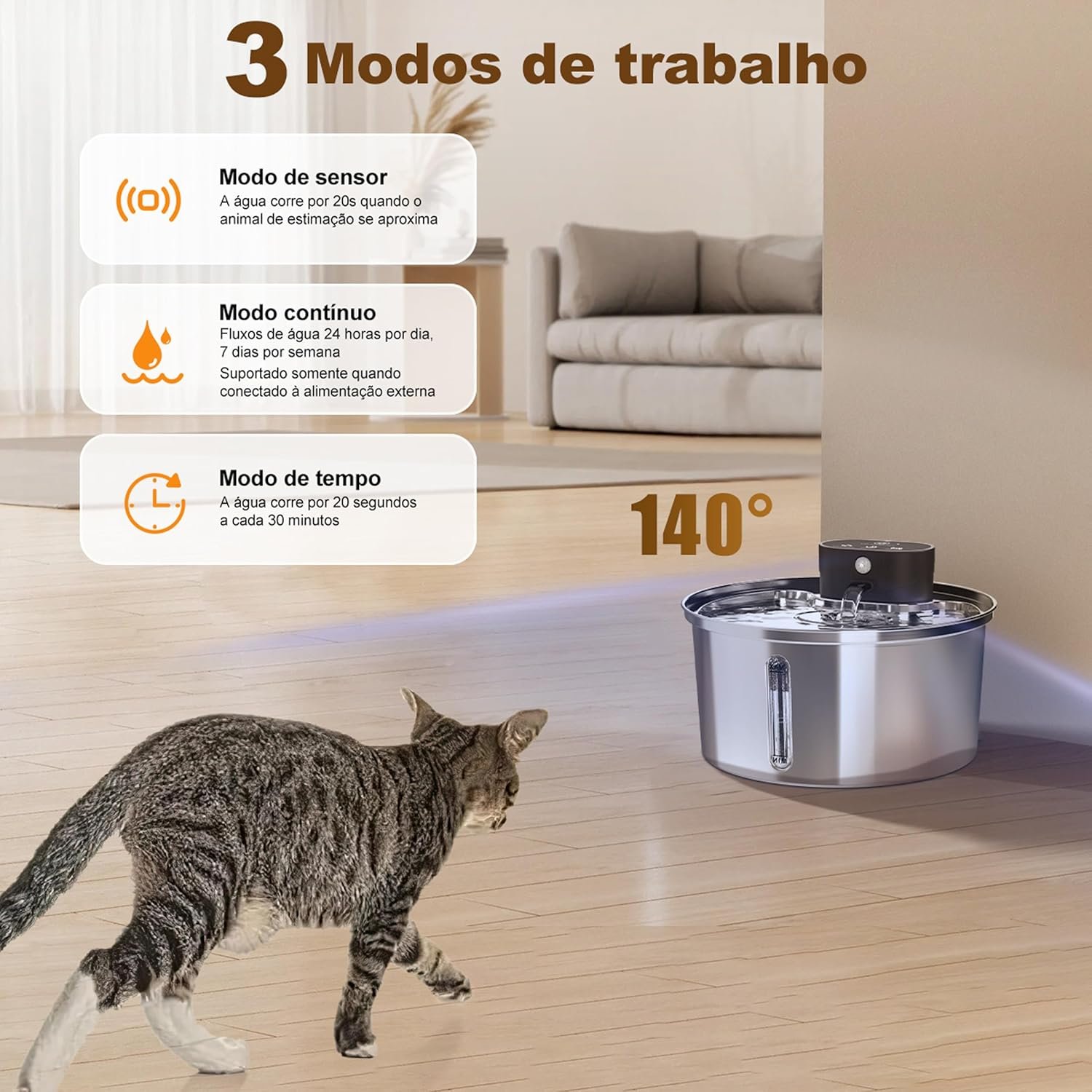 Saúde Renal Priorizada: O fluxo constante estimula o gato a beber mais água, prevenindo cálculos urinários.