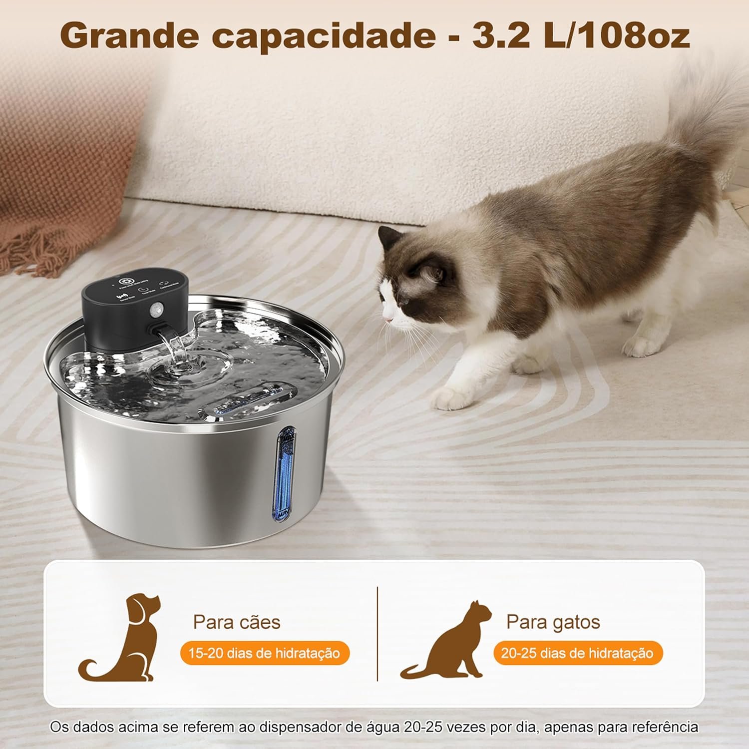 O Bebedouro para Gatos Fonte de Aço Inoxidável é o padrão ouro em hidratação felina. Diferente dos modelos de plástico, esta fonte é fabricada em aço inox 304 de grau alimentício, material que impede o acúmulo de bactérias e previne a acne felina. Com um reservatório generoso de 3.2 litros, o Bebedouro para Gatos Fonte de Aço Inoxidável oferece água fresca, oxigenada e segura por muito mais tempo, sendo ideal para múltiplos pets.