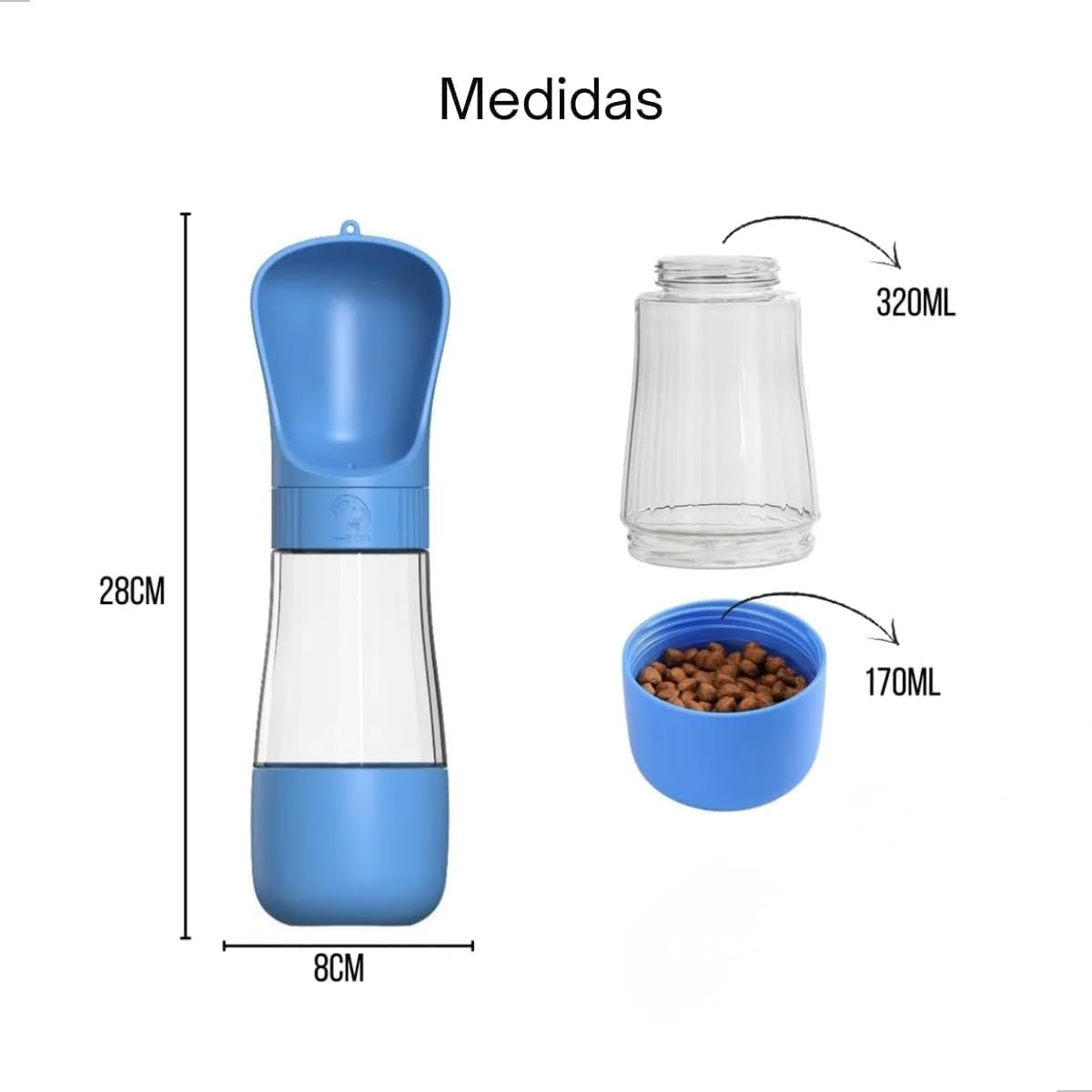 Design Dual Function: A Garrafa Pet Portátil 2 em 1 possui compartimentos separados para 320ml de água e 170ml de ração.